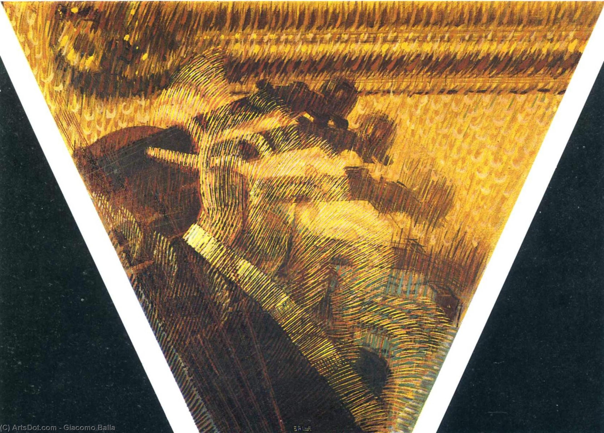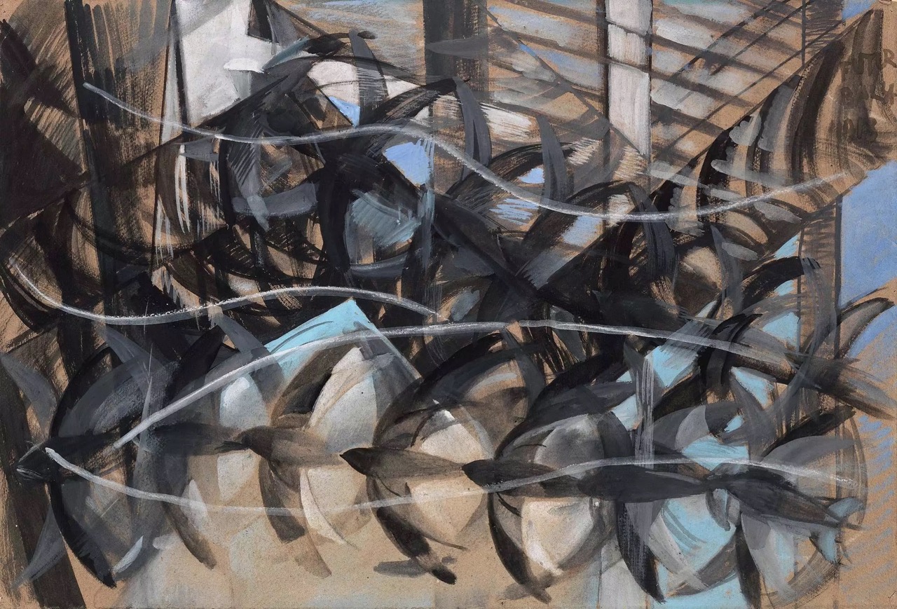 By late 1912 and early 1913, futurists increasingly turned toward mechanised subjects—automobiles, motorcycles, racing cyclists, trains, and urban crowds. In 1913, Balla produced Auto in corsa (studio) (Speeding Automobile (study), 1913) 12 and Velocità di motocicletta (studio) (Speed of a Motorcycle (study), 1913) 13, visualising Marinetti’s proclamation: “The world’s splendour has been enriched by a new beauty: the beauty of speed… A roaring automobile… that seems to run on shrapnel, is more beautiful than [The Winged] Victory of Samothrace.” Two years later, in 1915, the year Italy joined World War I, Gino Severini produced Treno blindato in azione (Armoured Train in Action) 14, an oil painting of five faceless soldiers aiming their rifles out of a militarised locomotive. A war enthusiast, Severini’s composition combined Marinetti’s militant rhetoric with the mechanical pulse of the modern city.