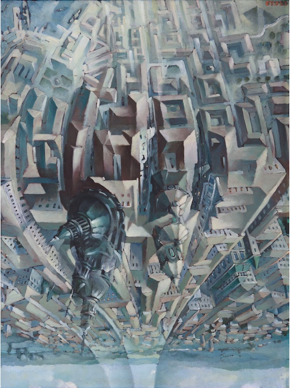By the 1930s, futurists once again pivoted, turning their gaze skyward toward air travel and technological communication. Under the banner of Aeropittura (Aeropainting), artists such as Sansoni (known as Tato) and Tullio Crali produced works that celebrated the nationalist and technological significance of aviation. Sansoni’s Sorvolando in spirale il Colosseo [Spiralata] (Flying Over the Coliseum in a Spiral [Spiraling], 1930) 23 captured the exhilaration, rapture, and vertigo of flight, while Crali’s Granvolta rovesciata [Giro della morte] (Upside-Down Loop [Death Loop], 1938) 24 and Prima che si apra il paracadute (Before the Parachute Opens, 1939) 25 dramatised aerial warfare as World War II approached.