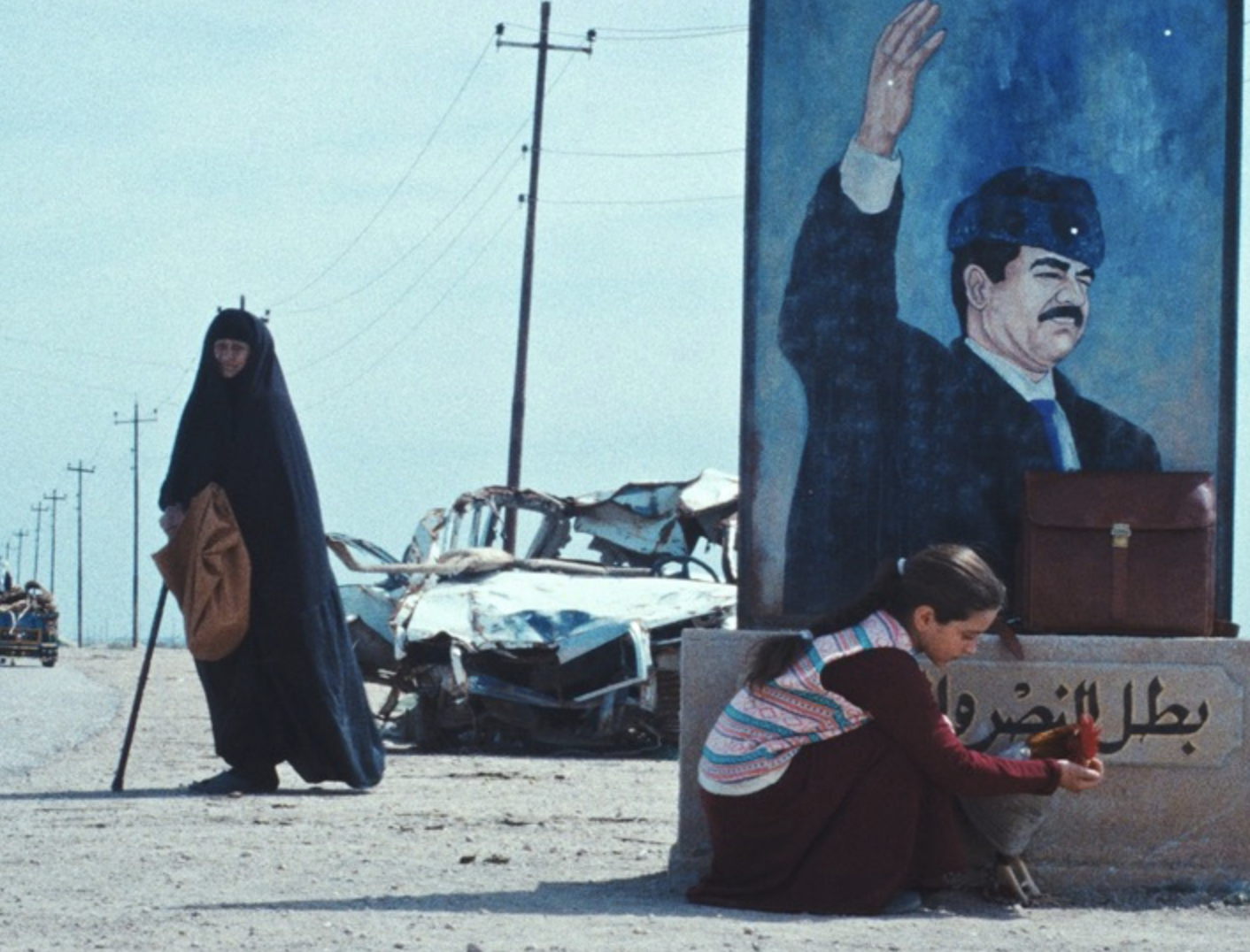 Unable to afford the basic ingredients due to said sanctions—eggs, flour, sugar—Lamia nonetheless embarks on a chaotic but tragicomic journey into Baghdad, accompanied by her spirited friend Saeed (Sajad Mohamad Qasem) and her pet rooster, Hindi. Along the way, encounters with adults reveal a world in which moral decisions are constantly negotiated, bent by necessity. The president himself is not a character, yet his presence is unmistakable. Embedded in classrooms, institutions, and domestic spaces, he watches silently through painted murals.
